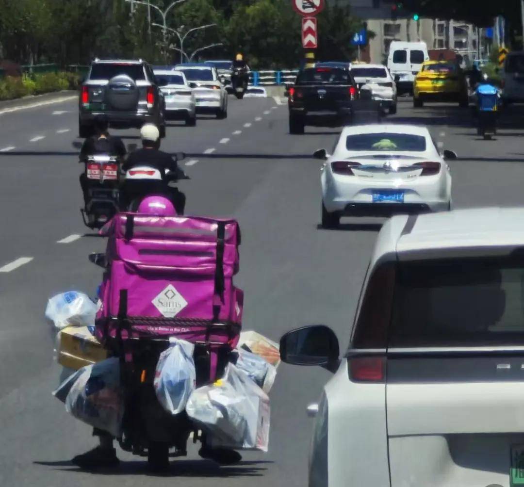 还有,挂满大件的山姆配送车,骑手的脚无法落在车上,只能悬空驾驶,在机动车道快速地穿梭,稍微的剐蹭可能就是一起交通事故……