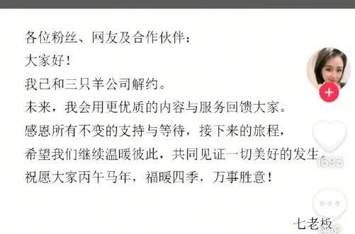 其中,七老板在个人社交媒体表示,自己已经和三只羊公司解约,未来,会用更优质的内容与服务回馈大家,感恩所有不变的支持与等待,接下来的旅程,希望我们继续温暖彼此……