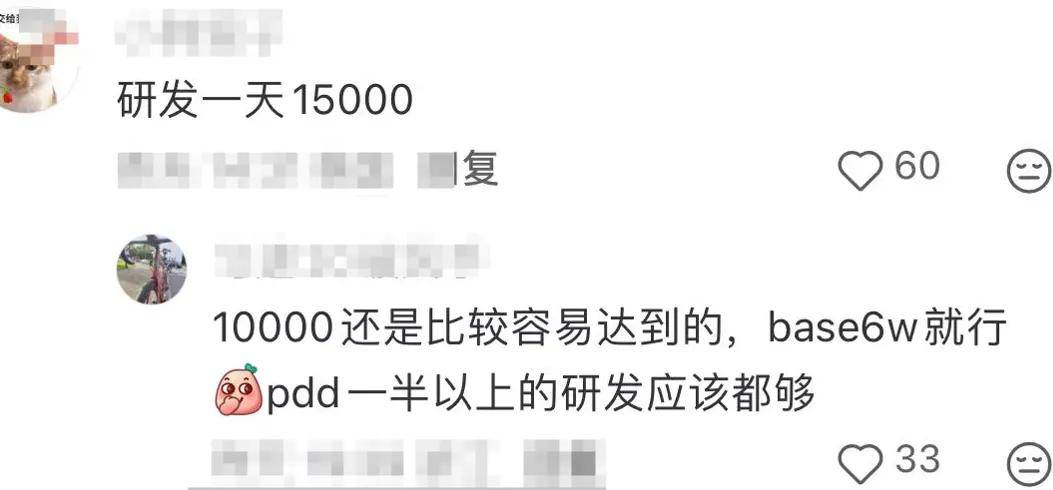 而在这些爆料帖的评论区,有人表示,研发岗一天15000元。也有人评论称,一天1万是比较容易达到的,base 6万就行,拼多多一半以上的研发应该都够。