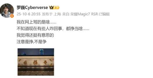 还有10月3日,罗巍在发布荣耀 Magic 8 Pro 夜景样张,重点展示 15 秒手持流光快门功能,却遭部分网友质疑照片质量。面对批评,罗巍直接发文称“好像 SB 们又沸腾了”