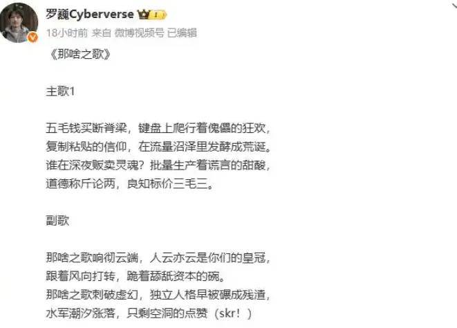 10月9日更是作诗一首:五毛钱买断脊梁,键盘上爬行着傀儡的狂欢……跟着风向打转,跪着舔舐资本的碗。