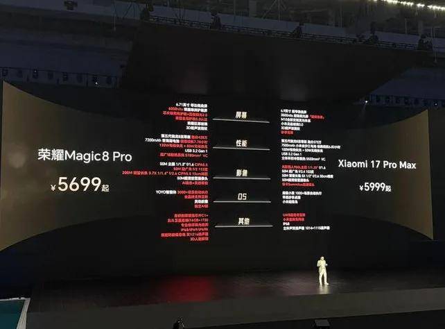 而除了这些不点名的内涵友商,荣耀Magic8系列的整场发布会,则是密集的出现了小米的字眼,比如晒跑分成绩的时候,荣耀Magic8 Pro也是碾压了小米17Pro Max.