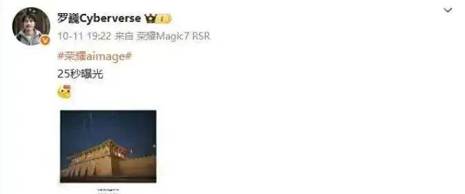 再然后是还有10月11日,罗巍在社交媒体晒出荣耀手机拍摄样片,并备注25秒曝光。