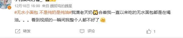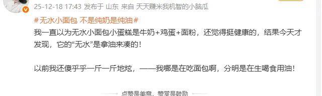 有网友表示:我一直以为无水小面包小蛋糕是牛奶+鸡蛋+面粉,还觉得挺健康的,结果今天才发现,它的“无水”是拿油来凑的!以前我还傻乎乎一斤一斤地炫,——我哪是在吃面包啊,分明是在生喝食用油!
