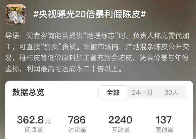 而这些商家,则更是将良知扔进垃圾桶疯狂地捞金,前几天,小柴曾报道了这些年备受健康养生人士追捧的陈皮塌房事件陈皮塌房成最大智商税!地理标年份随便贴成本70元工艺皮卖上千……