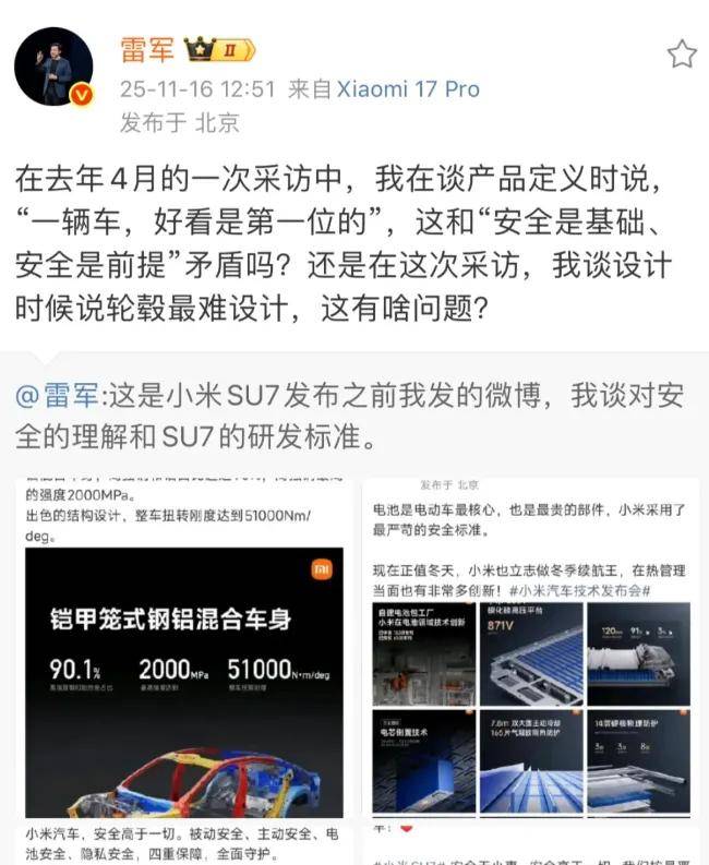 比如雷军本人在社交媒体上的发文,风格大变,不断地在社交媒体上自证小米汽车很安全,甚至翻旧文,以及反问这些米黑!